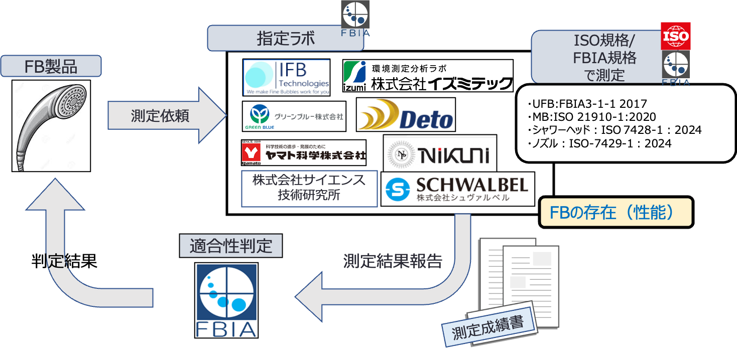 ファインバブルの性能測定は、自社内や外部試験機関などで測定した測定成績書で構いません。しかしながら、試験内容についてはFBIAで妥当性を審査します。申請者から提出されたFB測定性能データをFBIAが測定方法、測定結果の妥当性両面から審査し、FB存在(使用)に関して確認します。